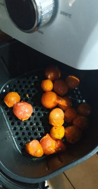 Para el tomate confitado: Agregue los tomates cherry dulces de su elección y media cucharadita sopera de ajo triturado en una cacerola pequeña de fondo grueso. Cubra con aceite de oliva hasta que todo esté sumergido. En la sartén desde frío colocar todos los ingredientes. Llevar al fuego a temperatura media y dejar los tomates cherry confitados cocinar alrededor de 20 minutos. A mitad de cocción dar la vuelta a todos los ingredientes pero cuidado con los ajos que no lleguen a quemarse. También los puede confitar en la airfryer 10 minutos a 160 grados centígrados.