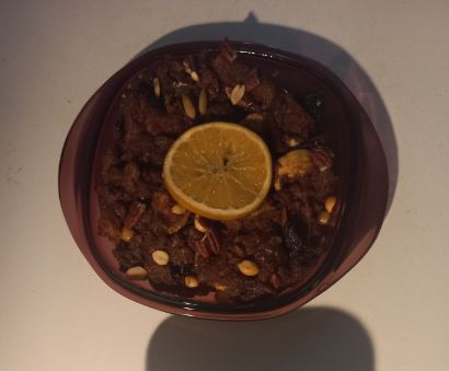 Servimos nuestra porción deseada como un budin. Se disfruta fría o caliente y puede decorar con los mismos frutos secos o naranja confida, como en mi caso.